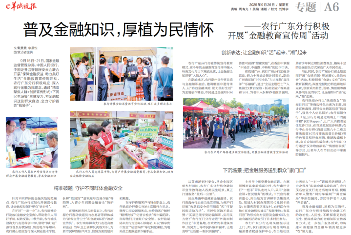 9月15日-21日,国家金融监督管理总局、中国人民银行、中国证券监督管理委员会联合开展“保障金融权益助力美好生活”金融教育宣传周活动。农行广东分行积极响应,深入践行金融为民理念,通过“精准聚焦人群+创新宣传形式+下沉民生场景”三维发力,将金融知识送到群众身边,全力守护百姓“钱袋子”。